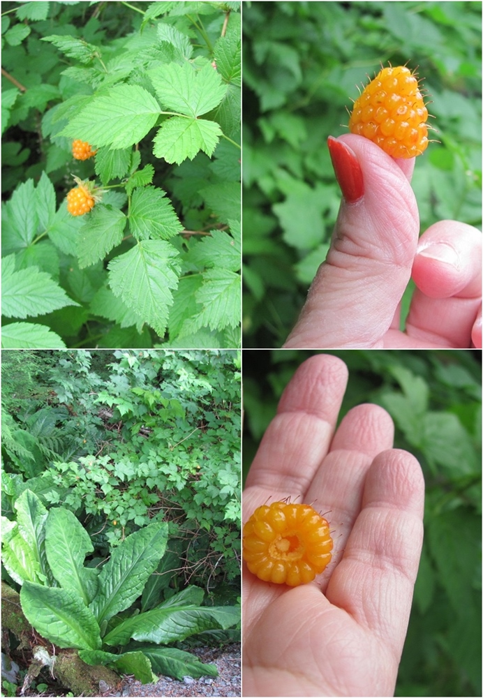 These are salmonberries. The one I'm holding is fully ripe.