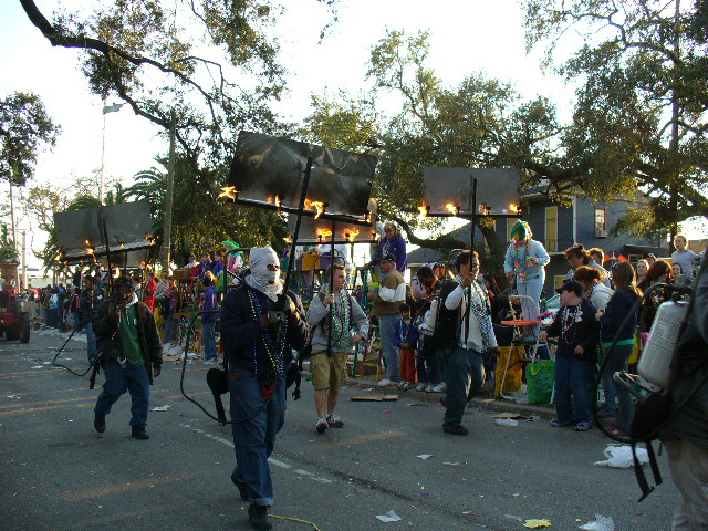 These are the FLAMBEAU. In the old days, they lit the way for the parade.